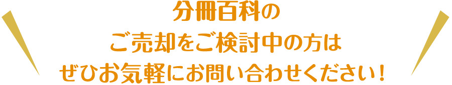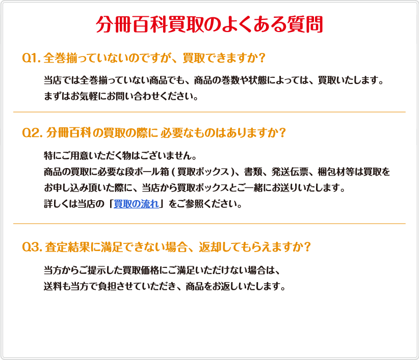 分冊百科買取のよくある質問:Q1.全巻揃っていないのですが、買取できますか?A1.当店では全巻揃っていない商品でも、商品の巻数や状態によっては、買取いたします。まずはお気軽にお問い合わせください。/Q2.分冊百科の買取の際に必要なものはありますか?A2.特にご用意いただく物はございません。商品の買取に必要な段ボール箱(買取ボックス)、書類、発送伝票、梱包材等は買取をお申し込み頂いた際に、当店から買取ボックスとご一緒にお送りいたします。詳しくは当店の「買取の流れ」をご参照ください。/Q3.査定結果に満足できない場合、返却してもらえますか?A3.当方からご提示した買取価格にご満足いただけない場合は、送料も当方で負担させていただき、商品をお返しいたします。