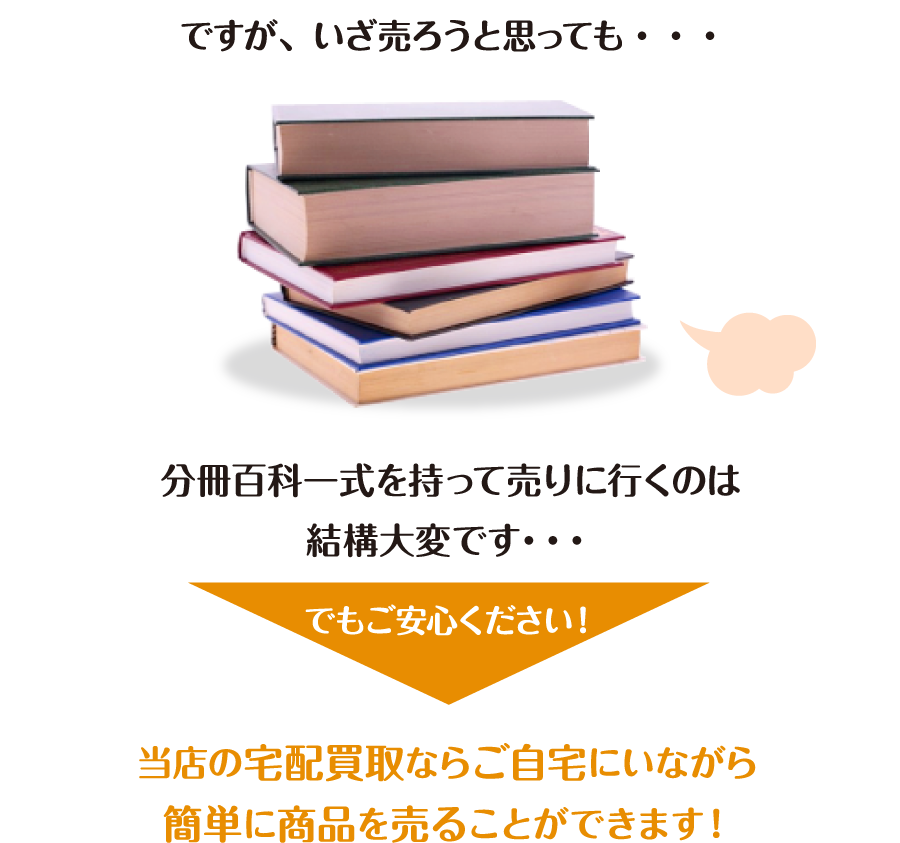ですが、いざ売ろうと思っても・・・分冊百科一式を持って売りに行くのは結構大変です・・・でもご安心ください。当店の宅配買取ならご自宅にいながら簡単に商品を売ることができます!