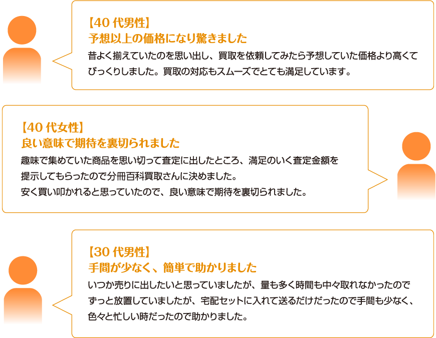 【40代男性】予想以上の価格になり驚きました。昔よく揃えていたのを思い出し、買取を依頼してみたら予想していた価格より高くてびっくりしました。買取の対応もスムーズでとても満足しています。/【40代女性】良い意味で期待を裏切られました。趣味で集めていた商品を思い切って査定に出したところ、満足のいく査定金額を提示してもたらったので分冊百科買取さんに決めました。安く買い叩かれると思っていたので、良い意味で期待を裏切られました。/【30代男性】手間が少なく、簡単で助かりました。いつか売りに出したいと思っていましたが、量も多く時間も中々取れなかったのでずっと放置していましたが、宅配セットに入れて送るだけだったので手間も少なく、色々と忙しい時だったので助かりました。